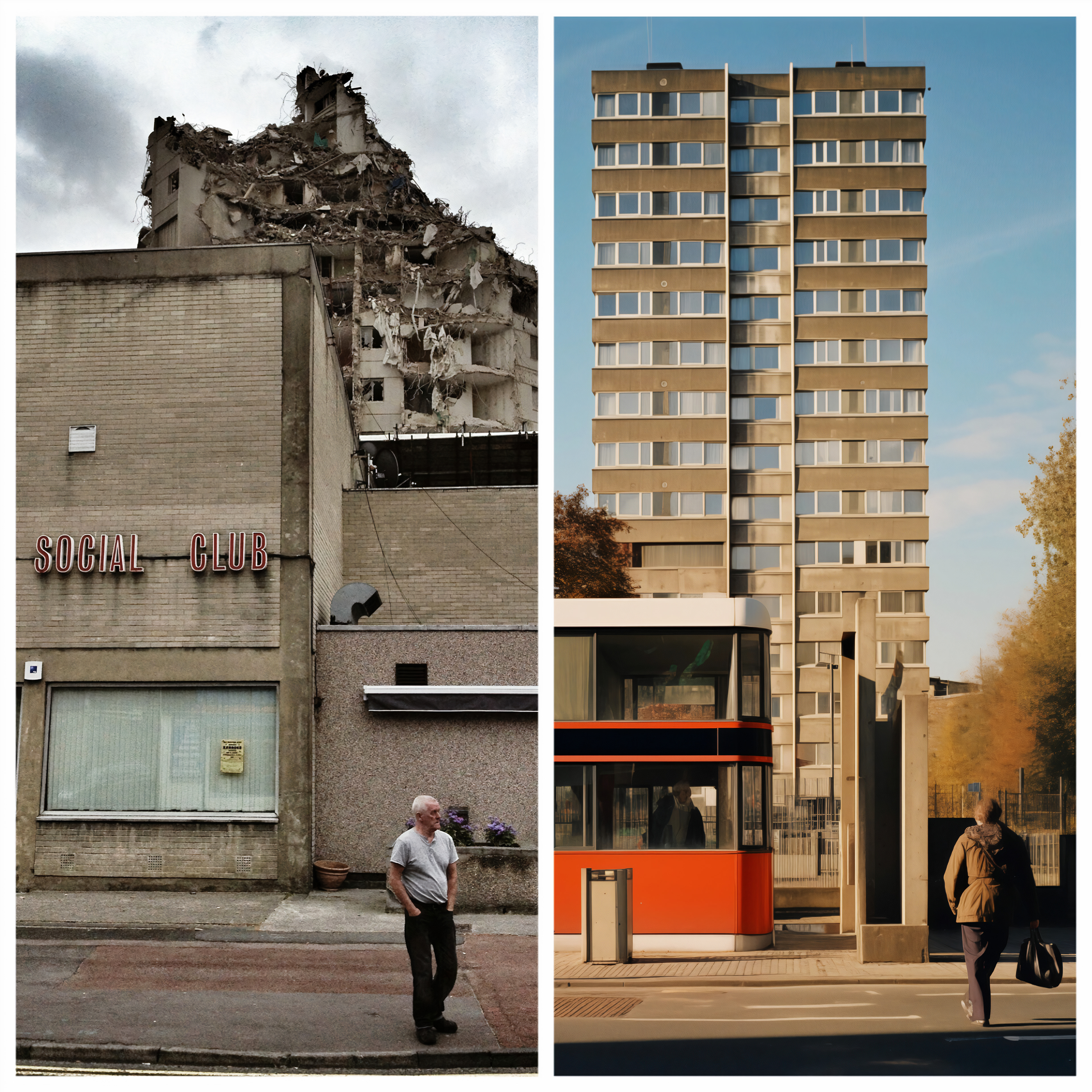 In my work, "Echoes of Transition," I juxtapose the tangible decay captured in a photograph of a weathered social club amidst demolition with its AI-generated counterpart, where vibrant urbanism replaces desolation.